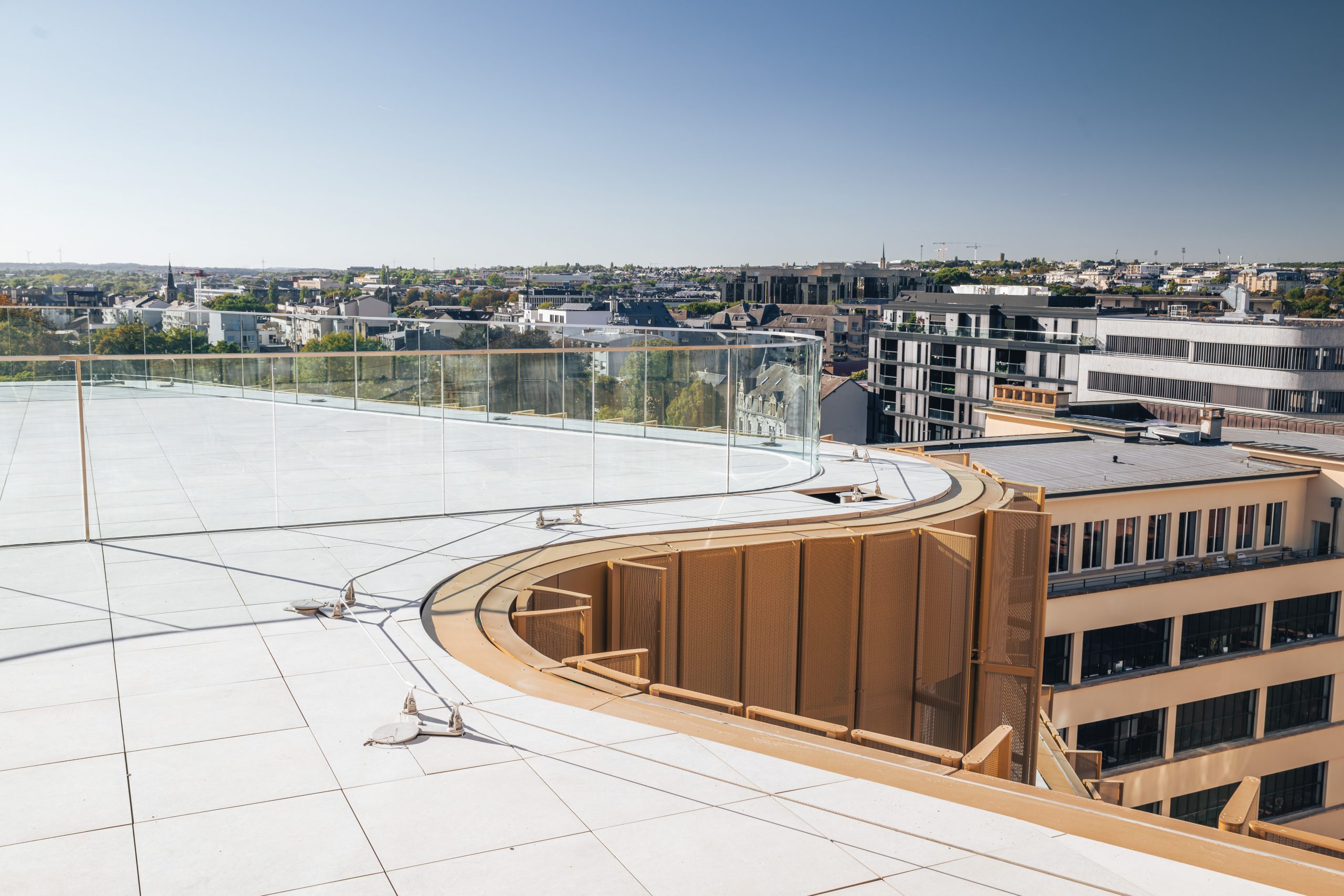 Le volume neuf émerge en créant, par ses formes et son matériau, un dialogue avec le bâtiment existant afin de valoriser le patrimoine architectural et sa rencontre avec une architecture contemporaine emblématique.